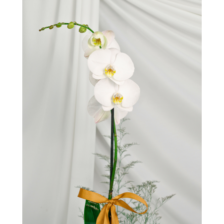 A beautiful hand selected white phalaenopsis orchid plant that we present in a spherical glass container (can be white or black). Available in a deluxe version, with complementing moss, this choice is the very definition of elegance.
