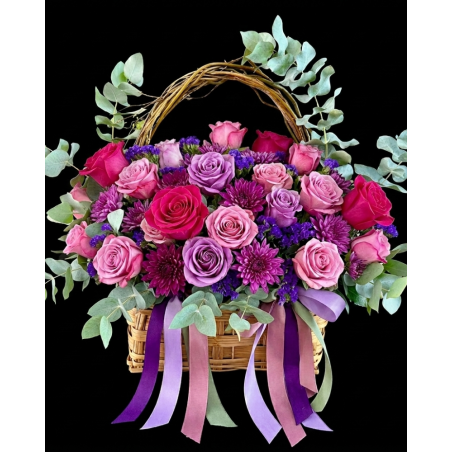Over 50 gorgeous blooms of roses in different shades of pink are gathered into a handmade basket with green and purple mums and fresh eucalyptus. Same Day Delivery - please place your order by 2pm weekdays or by 12pm Saturday or call (+52) 55 11 34 68 22
