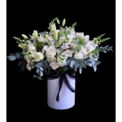Send a beautiful expression of caring with this stunning white arrangement featuring roses, asiatic lilies, alstroemerias, eucalyptus and assorted greenery. It is delivered in a white glass vase.