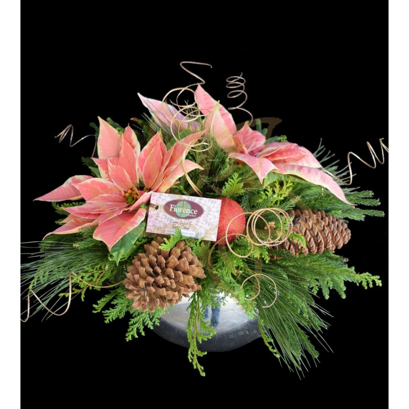 Traditional and elegant centerpiece with natural Poinsettia Flowers, fresh seasonal foliage, pine cones and ornaments.