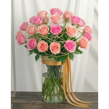 Simple yet stunningly elegant, this gorgeous design will be the perfect gift. Two dozen long-stemmed Premium roses accented with seasonal foliage in a classic glass vase. Please request your favorite color of roses. Same Day Delivery - please place your order by 2pm weekdays or by 12pm Saturday or call (+52) 55 11 34 68 22