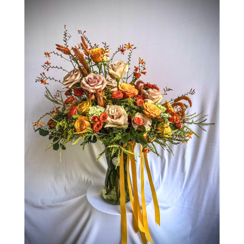 Beautiful and classic arrangement with a garden feel and seasonal blooms arranged in a natural way.
