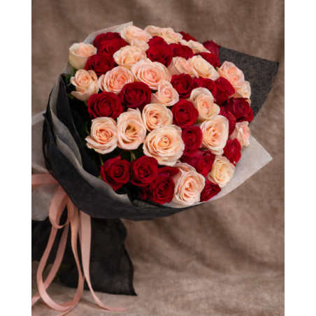 Bouquet of 50 stems of red and peach roses. Intense and vibrant red roses, with petals of a deep and brilliant color, adding a touch of romance and emotion as classic symbols of passionate love. For their part, pastel roses have soft tones, transmitting sweetness and elegance, creating a romantic atmosphere.