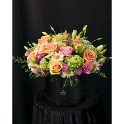 Elegant and sophisticated arrangement, presented on a black cylindrical base that contrasts with the soft and vivid colors of the flowers. The arrangement includes a harmonious combination of: Roses and Lisianthus in pastel tones, green Hydrangeas, Daisies and small purple flowers, as well as fine greens that provide a fresh and organic finish, creating fluidity in the design.