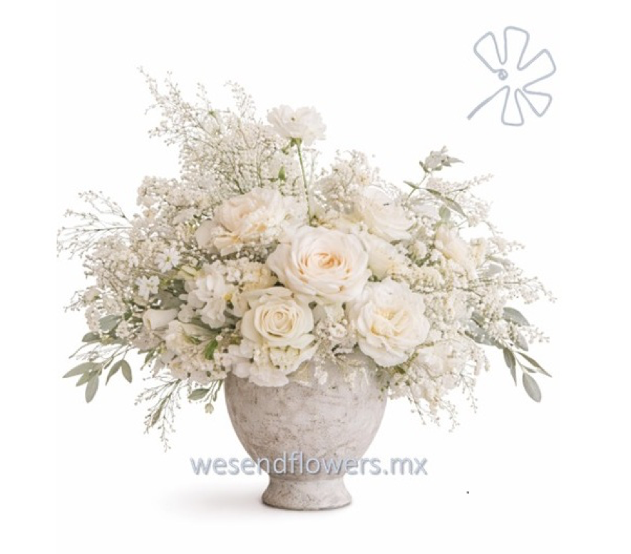 Incluye: Flor premium en tonos blancos y crema; Diseño editorial hecho a mano; Jarrón de cerámica o según disponibilidad), Certificado “Cloud Dancer / by: We.sendflowers