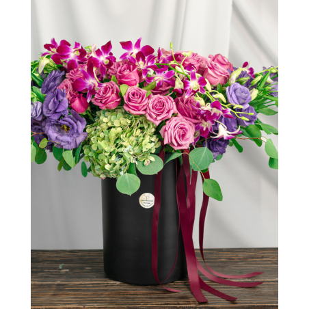 Bellísimo diseño con dos docenas de rosas, acompañado de orquídea Dendrobium, hortensia azul-verde, y lisianthus morados, dispuesto en un elegante cilindro de cristal negro, es una verdadera obra de arte floral. La combinación de flores resalta una rica paleta de colores y texturas, donde las rosas aportan romanticismo, las orquídeas un toque exótico, las hortensias frescura, y los lisianthus morados elegancia y sutileza.