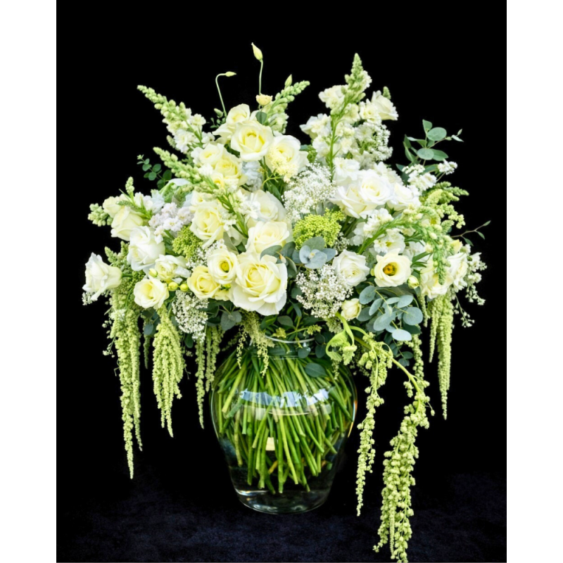 Original diseño con rosas, lisianthus, matsumotos, hortensias, limonium y follaje fino en bolsa de palma tejida a mano. Arreglo disponible para e...
