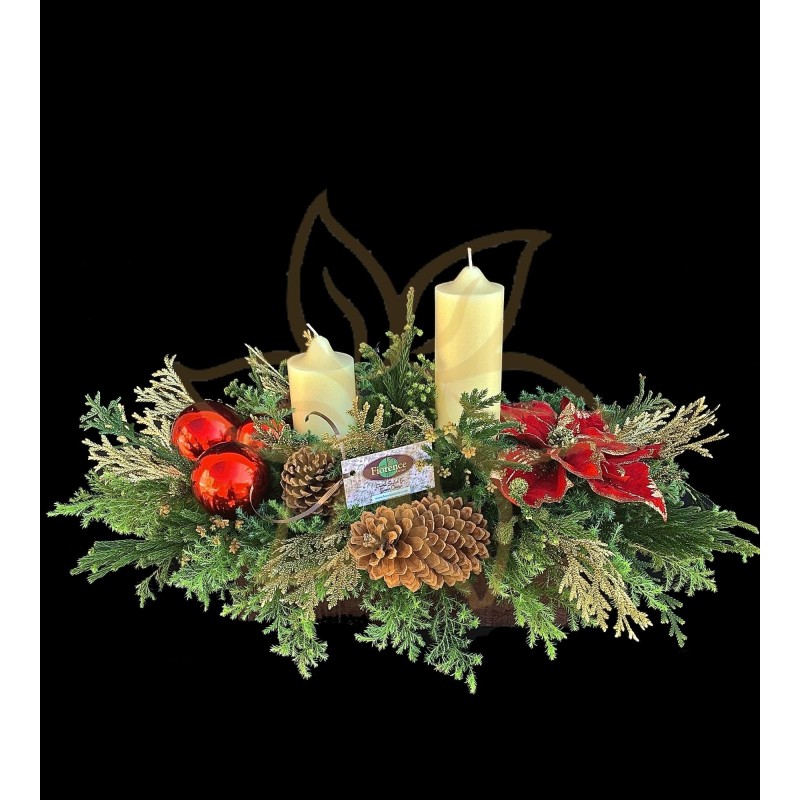 Elegante y clásico Centro de Mesa navideño con fresco y aromático follaje de temporada, piñas, esferas, flores de Nochebuena y velas. Arreglo disponible para entrega al día siguiente. Por favor haga su pedido con 24 horas de anticipación.