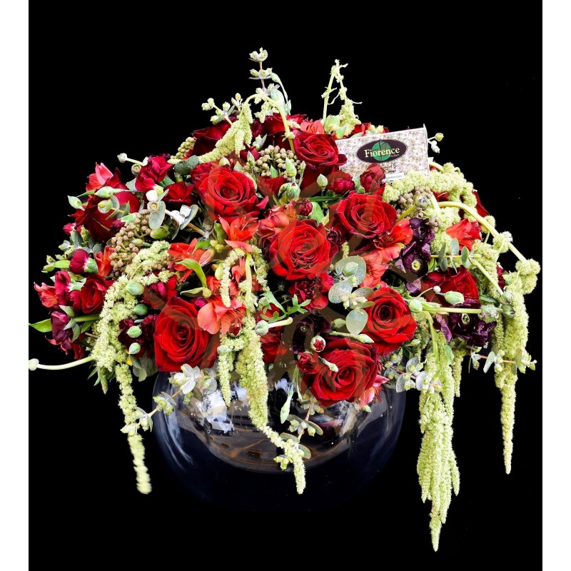 Impresionante diseño de Rosas en perfecta armonía con flores rojas de la estación y follajes frescos en una base esférica de cristal.