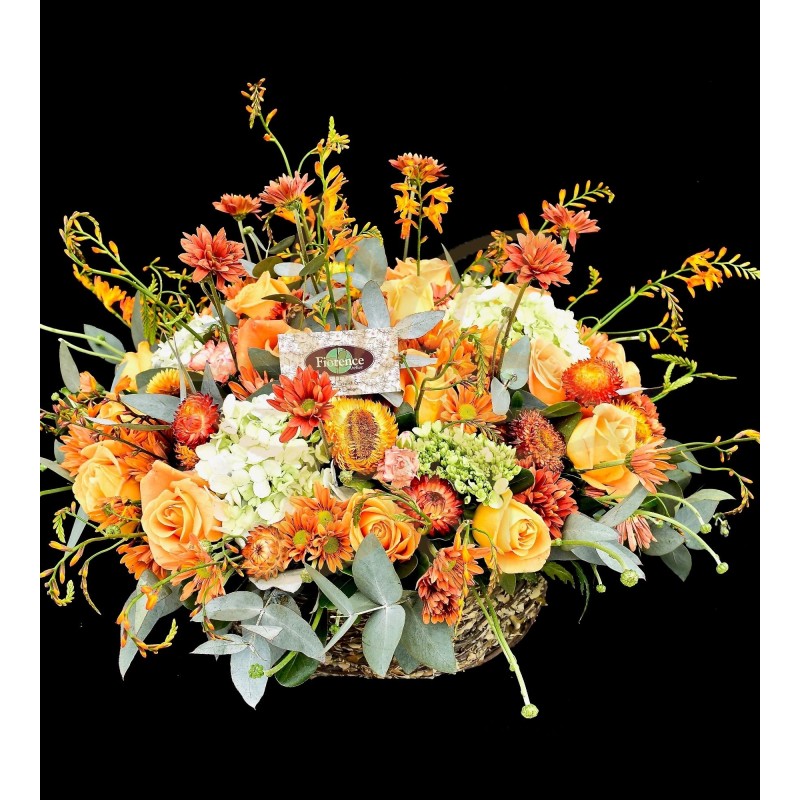Bellísima canasta de flores llena de increíbles tallos de rosas color mandarina, margaritas, flores inmortales, hortensias acentuadas con eucalipto y flores de la estación. Si alguna de las flores o follajes que muestra la foto no están disponibles, nuestros expertos diseñadores los remplazarán por flores de colores similares de igual o mayor valor. El arreglo que usted ordenó será del mismo tamaño y tendrá el mismo diseño. TAMAÑO: 70cm x 55cm Para hacer su obsequio de flores más especial le recomendamos agregar unas deliciosas Trufas Artesanales, manufacturadas especialmente para Fiorence Atelier Floral.