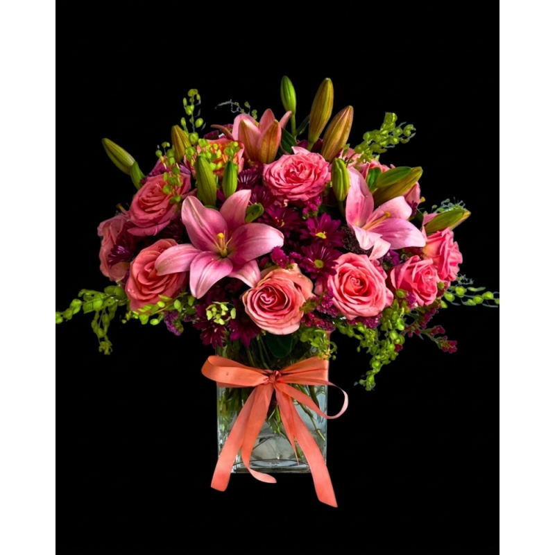Hermoso arreglo en tonos de Rosas desarrollado con Lilis, Rosas, Alstroemerias y follajes frescos, todo colocado en un increíble cubo de cristal.