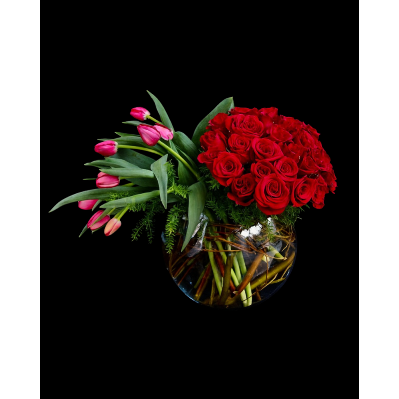 Arreglo con dos docenas de hermosas rosas rojas acompañadas con diez bellísimos tulipanes y follajes frescos en una bowl de cristal.