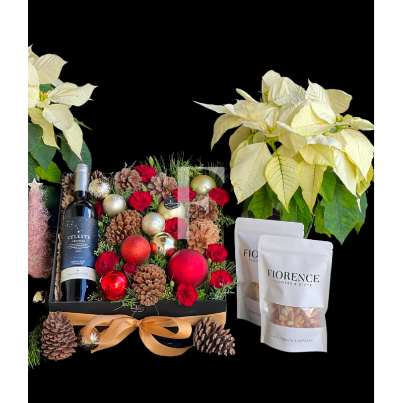 Decoración y acentos navideños con esferas piñas , follajes navideños y flores.