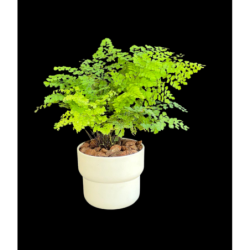 Adiantum o Cilantrillo. Hermoso helecho de finitas hojitas verde limón en maceta de plástico reciclado blanco.