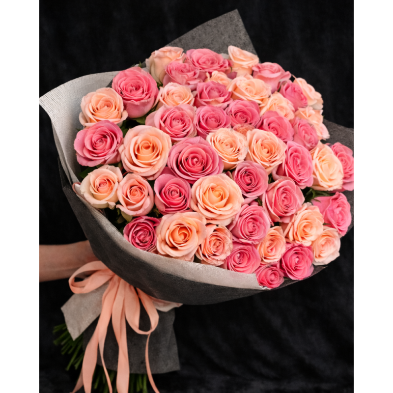 50 tallos de rosas rosas y durazno. La armonía generada por rosas color durazno y rosa nos provoca sensaciones dulces y tiernas. Este ramo lleno de presencia y elegancia es perfecto para un cumpleaños , agradecimiento o acompañar cualquier sentimientos o emoción muy especial.
