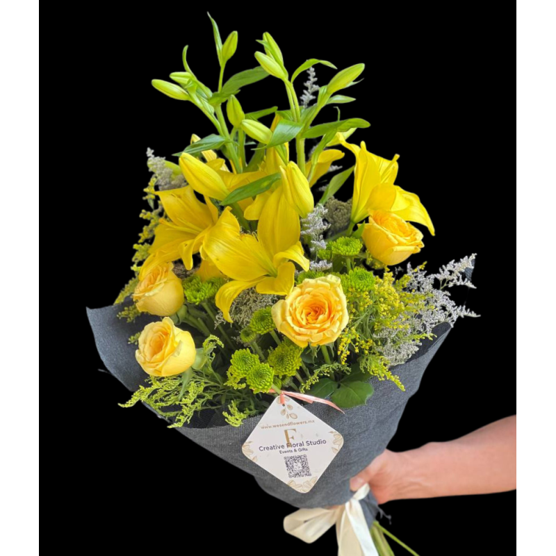 Elegante combinación de lindas flores amarillas, atadas en un delicado ramo con gran presencia e impacto.