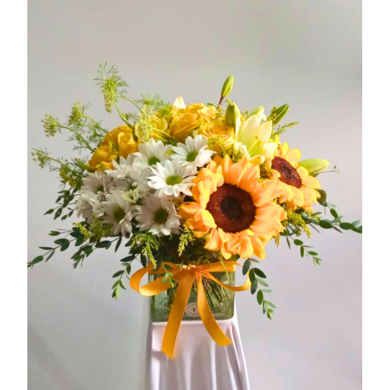 Fresco y alegre diseño con una bella combinación de texturas florales como rosas, girasoles, margaritas, lilis, encaje y eucalipto haciendo armonía en una base de cristal.