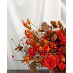Este diseño atemporal evoca la esencia romántica del otoño, con rosas de un vibrante color naranja que se entrelazan con texturas y follajes característicos de la temporada, acentuados por el eucalipto marrón. Cada flor ha sido seleccionada para capturar la calidez y la nostalgia de las tardes otoñales, creando un arreglo perfecto para quienes buscan un toque de romanticismo en sus espacios. Todo se presenta en una elegante maceta de barro artesanal, añadiendo un marco natural y auténtico que resalta la belleza de esta composición.