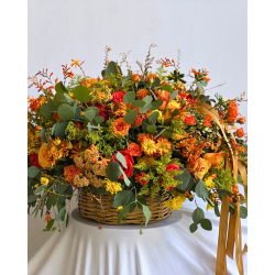 Esta hermosa canasta de bejuco tiene las flores más frescas de la temporada otoñal. Sus colores vibrantes en tonos naranja, amarillo, verde y dorados nos remite a un fresco jardín otoñal lleno de texturas. Rosas, minirosas, crisantemos, margaritas, eucalipto, achileas son algunas de las texturas florales que usamos para este hermoso y tradicional diseño. Esta canasta es perfecta para un agradecimiento, una celebración o hasta un centro de mesa para esa reunión casual de fin de semana.