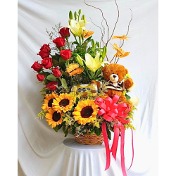"Cariño de barrio" por Wesendflowers, es una auténtica expresión de afecto que refleja el cariño de nuestra más auténtica forma de ser, especialmente pensado para nosotros en México. La calidez de los girasoles grandes representa la alegría y energía de nuestra cultura, mientras que las rosas rojas evocan la pasión y el amor. Los lirios blancos aportan elegancia y pureza, complementados por las flores naranjas, llenas de vitalidad. El toque especial lo da un tierno osito de peluche, una cinta rosada festiva y una caja de chocolates Ferrero Rocher.