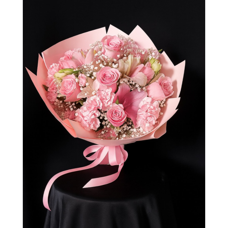Rosas premium, claveles, lirios y velo de novia en armonía rosada, envueltos en papel pastel y con un lazo de satín que resalta su encanto.