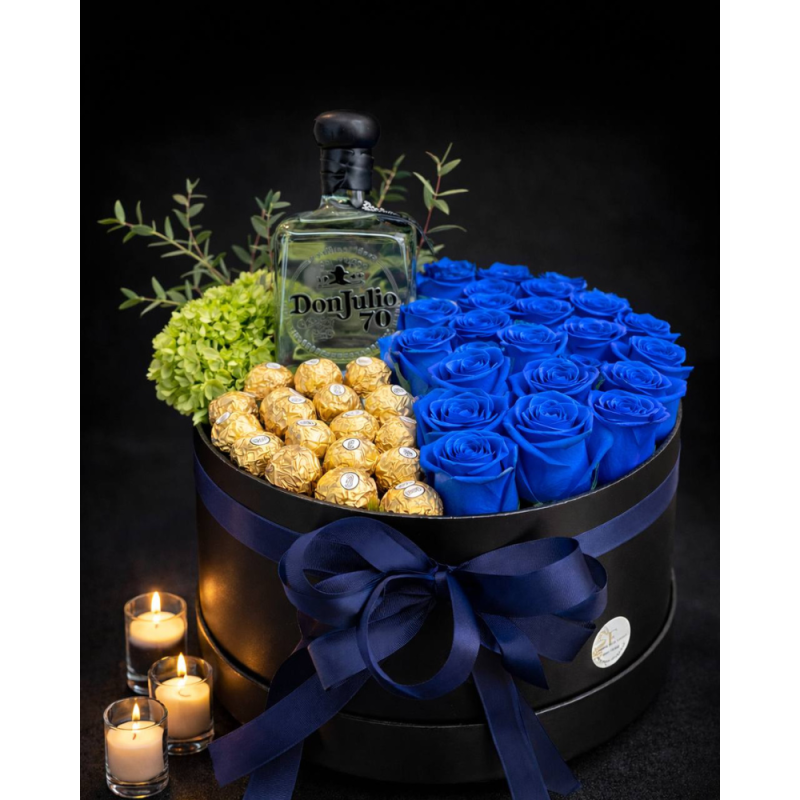 Rosas azules, tequila premium y chocolate: un detalle que se bebe, se siente y no se olvida.